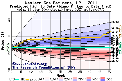 The high to date and low to date prices of the stock plotted against a random walk model for 2011 (what's this?).