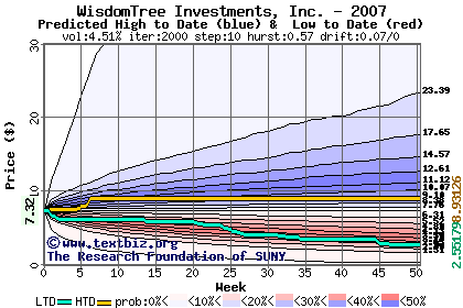 The high to date and low to date prices of the stock plotted against a random walk model for 2007 (what's this?).