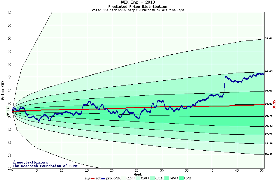 The following graph plots the year-to-date performance of the stock for 2010 compared to the probability calculated by a random walk model.