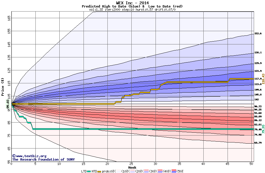 The following graph plots the year-to-date performance of the stock for 2014 compared to the probability calculated by a random walk model.