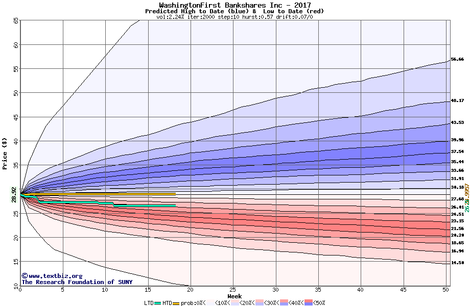 The high to date and low to date prices of the stock plotted against a random walk model for 2017 (what's this?).