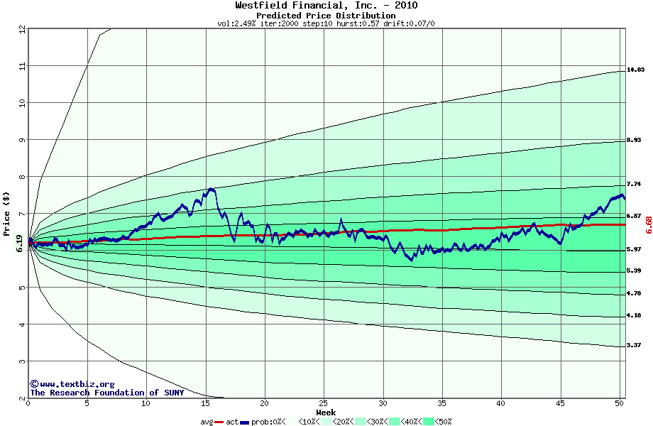 The following graph plots the year-to-date performance of the stock for 2010 compared to the probability calculated by a random walk model.