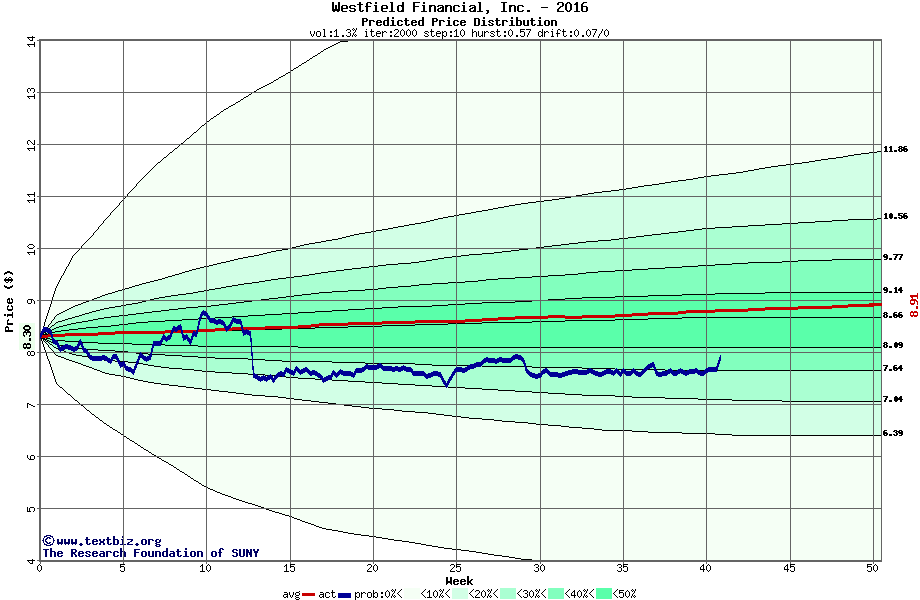 The following graph plots the year-to-date performance of the stock for 2016 compared to the probability calculated by a random walk model.