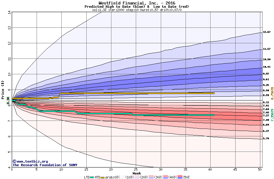 The high to date and low to date prices of the stock plotted against a random walk model for 2016 (what's this?).