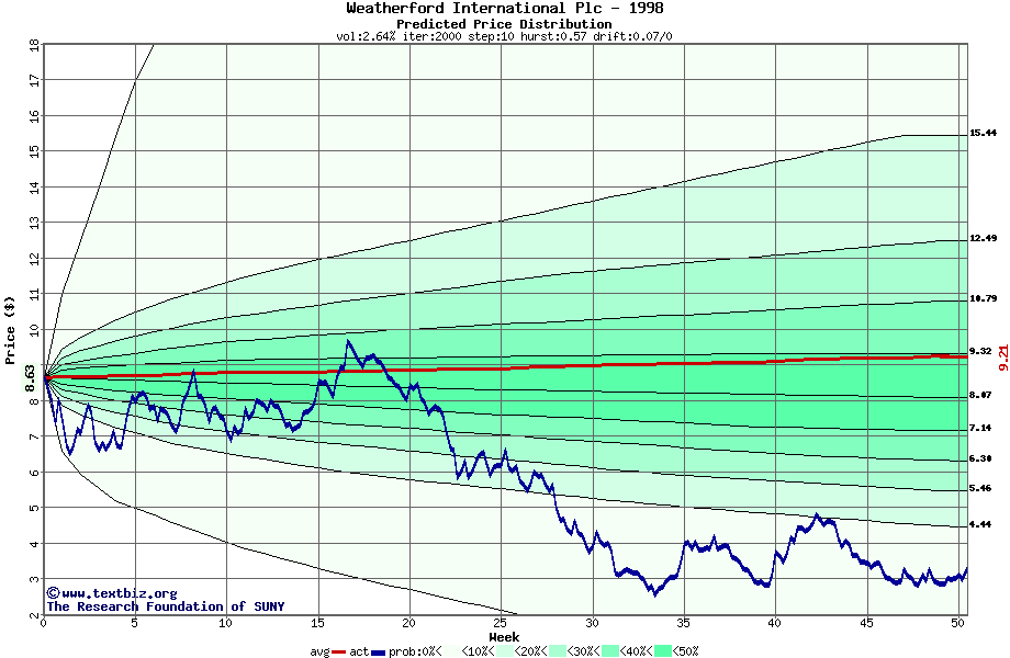 The following graph plots the year-to-date performance of the stock for 1998 compared to the probability calculated by a random walk model.