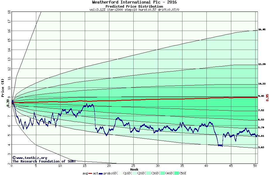 The high to date and low to date prices of the stock plotted against a random walk model for 2016 (what's this?).
