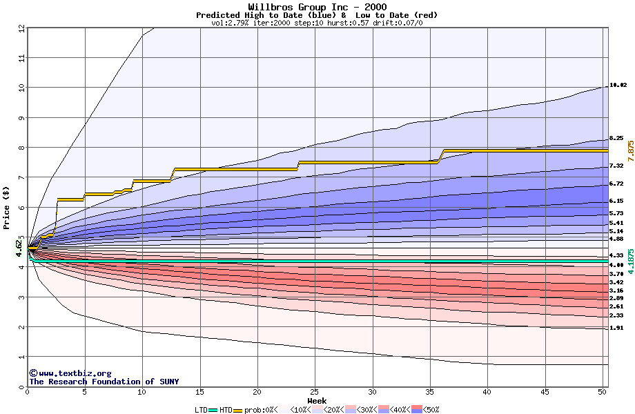 The high to date and low to date prices of the stock plotted against a random walk model for 2000 (what's this?).