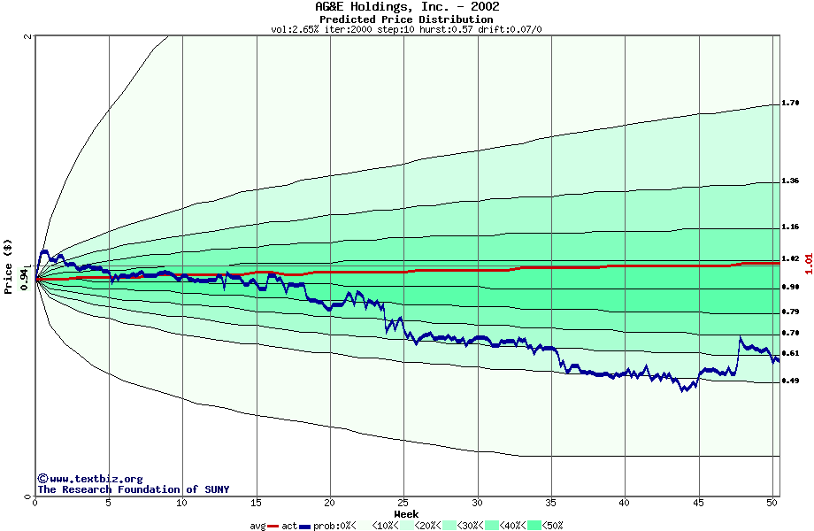 The high to date and low to date prices of the stock plotted against a random walk model for 2002 (what's this?).
