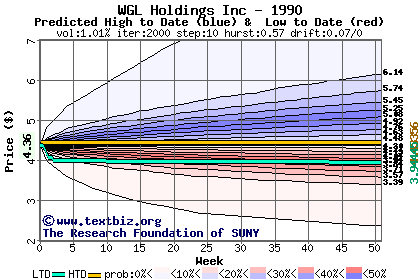 The high to date and low to date prices of the stock plotted against a random walk model for 1990 (what's this?).