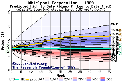 The high to date and low to date prices of the stock plotted against a random walk model for 1989 (what's this?).