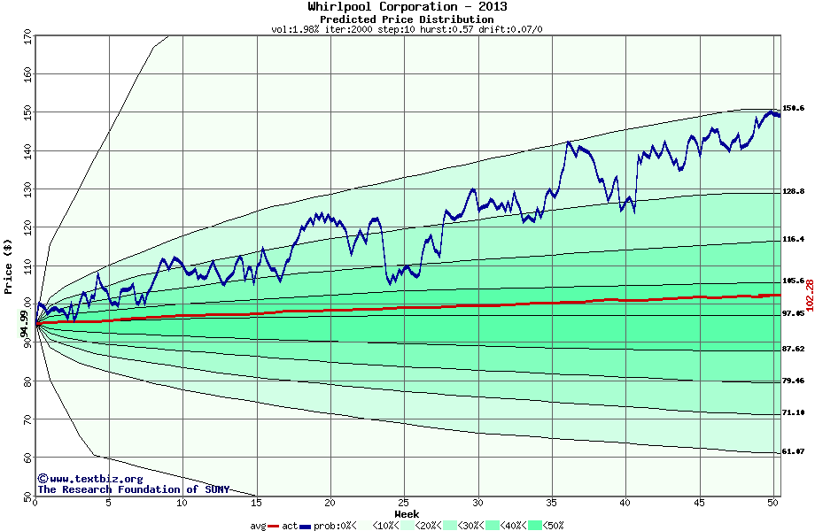 The following graph plots the year-to-date performance of the stock for 2013 compared to the probability calculated by a random walk model.