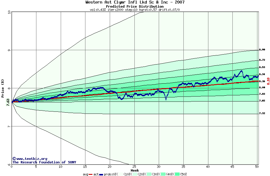 The following graph plots the year-to-date performance of the stock for 2007 compared to the probability calculated by a random walk model.