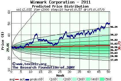 The high to date and low to date prices of the stock plotted against a random walk model for 2011 (what's this?).