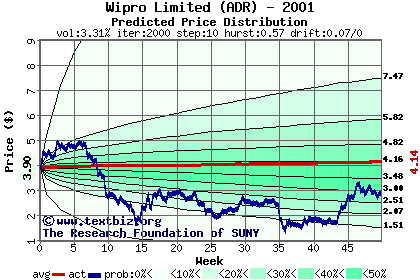 The high to date and low to date prices of the stock plotted against a random walk model for 2001 (what's this?).