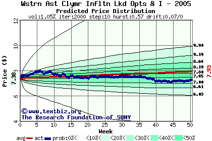 The following graph plots the year-to-date performance of the stock for 2005 compared to the probability calculated by a random walk model.