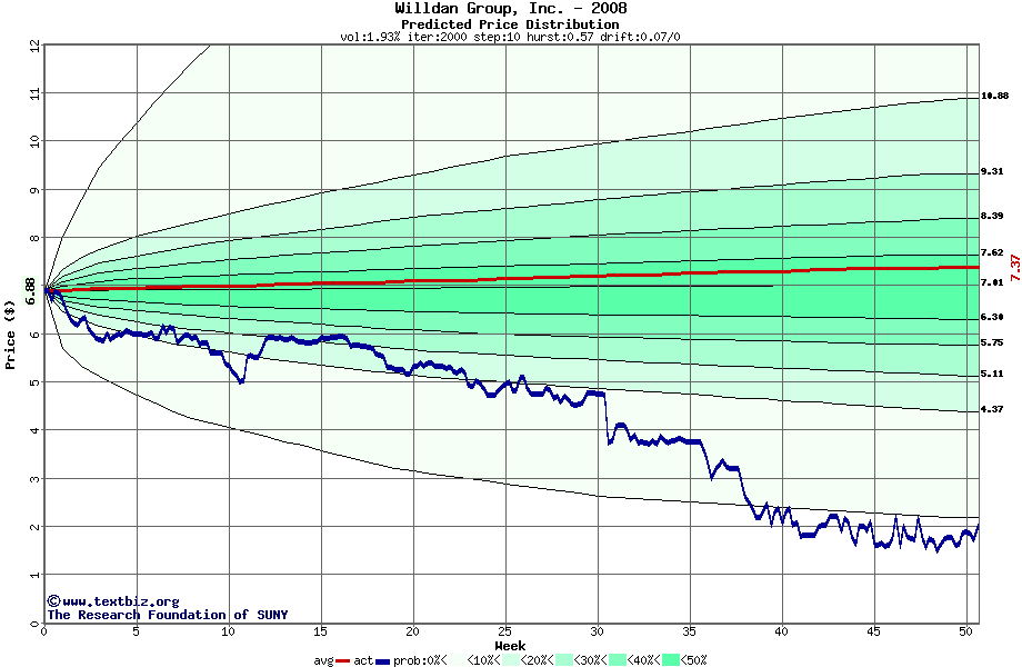 The following graph plots the year-to-date performance of the stock for 2008 compared to the probability calculated by a random walk model.