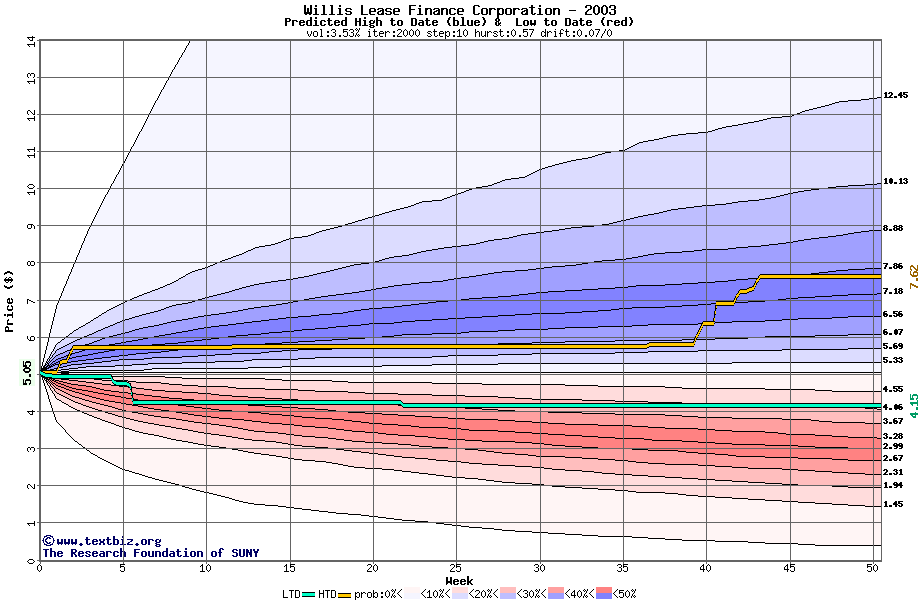 The high to date and low to date prices of the stock plotted against a random walk model for 2003 (what's this?).