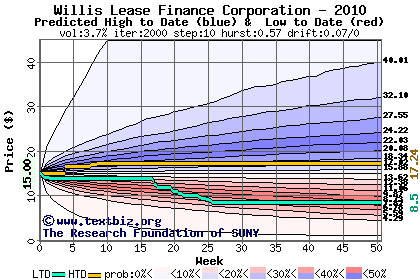 The high to date and low to date prices of the stock plotted against a random walk model for 2010 (what's this?).