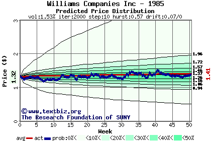 The high to date and low to date prices of the stock plotted against a random walk model for 1985 (what's this?).