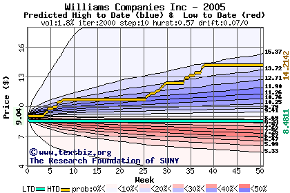 The high to date and low to date prices of the stock plotted against a random walk model for 2005 (what's this?).