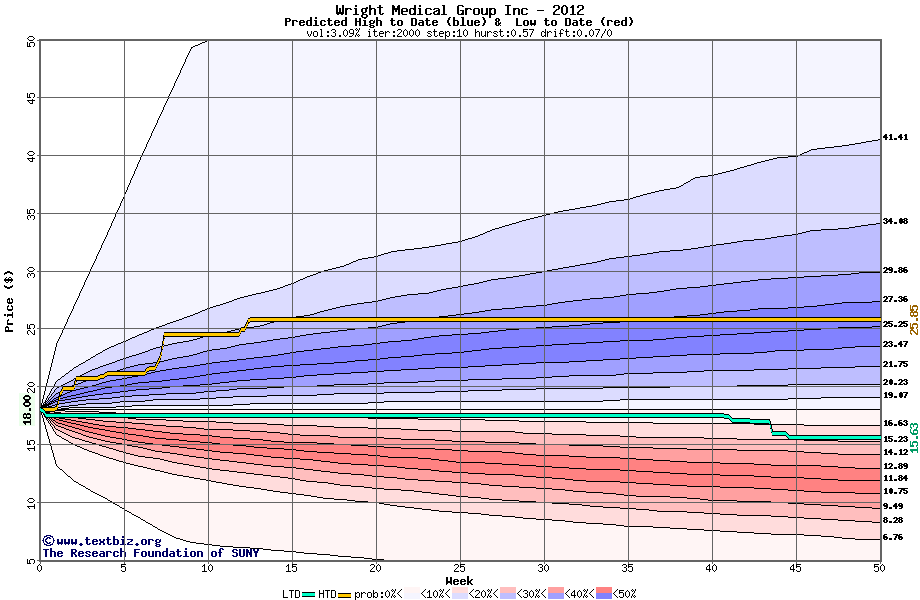 The following graph plots the year-to-date performance of the stock for 2012 compared to the probability calculated by a random walk model.