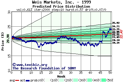 The high to date and low to date prices of the stock plotted against a random walk model for 1999 (what's this?).