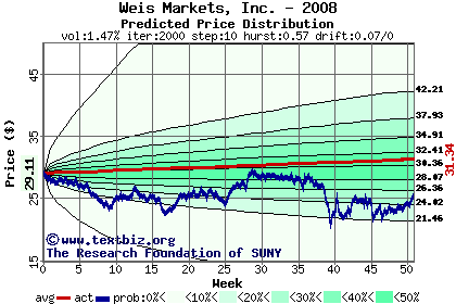 The following graph plots the year-to-date performance of the stock for 2008 compared to the probability calculated by a random walk model.