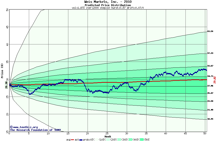 The following graph plots the year-to-date performance of the stock for 2010 compared to the probability calculated by a random walk model.