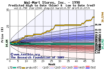 The high to date and low to date prices of the stock plotted against a random walk model for 1998 (what's this?).