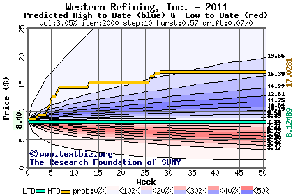 The high to date and low to date prices of the stock plotted against a random walk model for 2011 (what's this?).