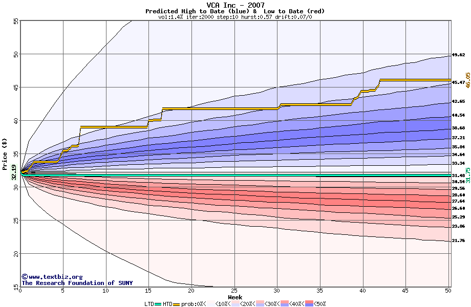 The high to date and low to date prices of the stock plotted against a random walk model for 2007 (what's this?).