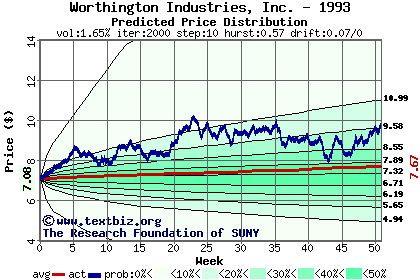 The high to date and low to date prices of the stock plotted against a random walk model for 1993 (what's this?).