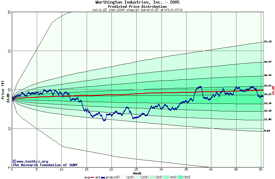 The following graph plots the year-to-date performance of the stock for 2005 compared to the probability calculated by a random walk model.