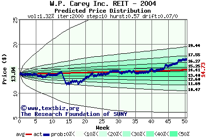 The following graph plots the year-to-date performance of the stock for 2004 compared to the probability calculated by a random walk model.