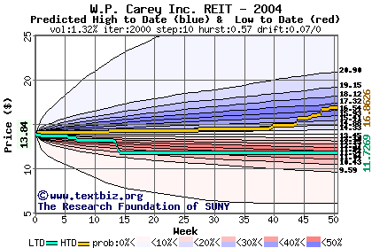 The high to date and low to date prices of the stock plotted against a random walk model for 2004 (what's this?).