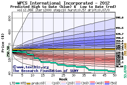 The high to date and low to date prices of the stock plotted against a random walk model for 2012 (what's this?).