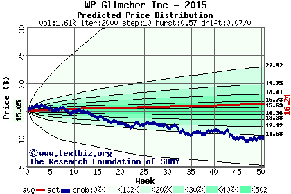The high to date and low to date prices of the stock plotted against a random walk model for 2015 (what's this?).