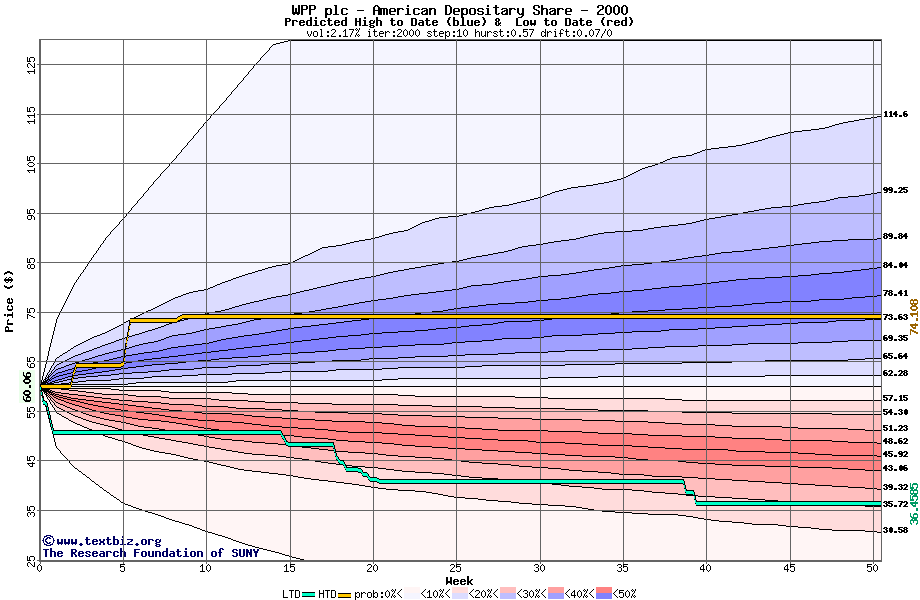 The high to date and low to date prices of the stock plotted against a random walk model for 2000 (what's this?).