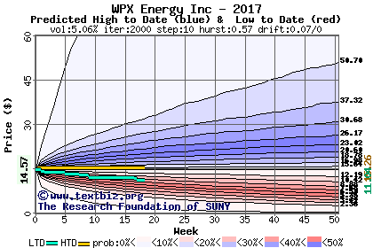 The high to date and low to date prices of the stock plotted against a random walk model for 2017 (what's this?).