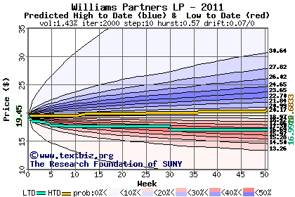 The high to date and low to date prices of the stock plotted against a random walk model for 2011 (what's this?).
