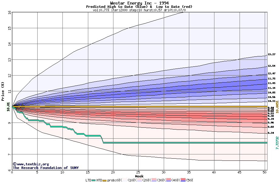 The high to date and low to date prices of the stock plotted against a random walk model for 1994 (what's this?).