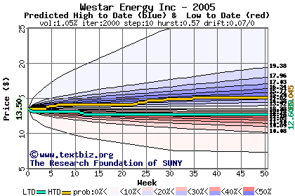 The high to date and low to date prices of the stock plotted against a random walk model for 2005 (what's this?).