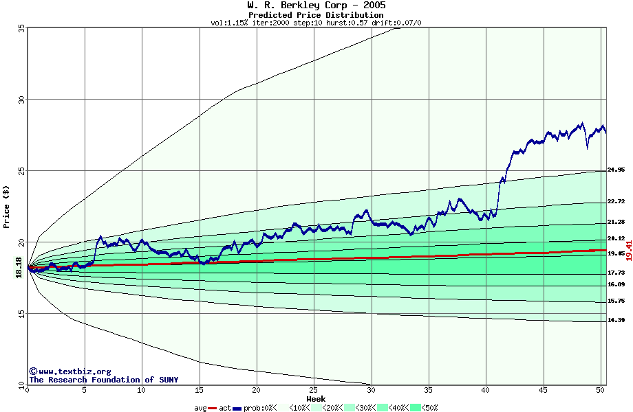 The following graph plots the year-to-date performance of the stock for 2005 compared to the probability calculated by a random walk model.