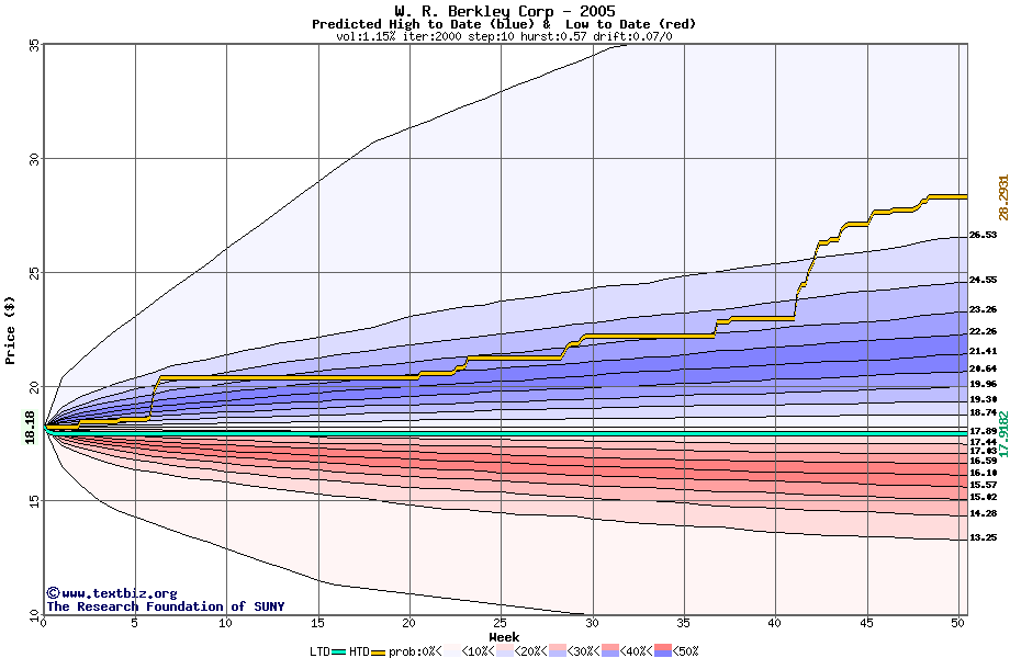 The high to date and low to date prices of the stock plotted against a random walk model for 2005 (what's this?).