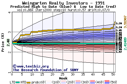 The high to date and low to date prices of the stock plotted against a random walk model for 1991 (what's this?).