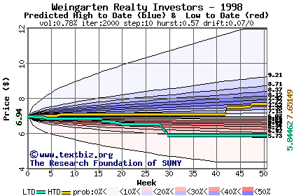 The high to date and low to date prices of the stock plotted against a random walk model for 1998 (what's this?).