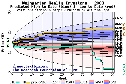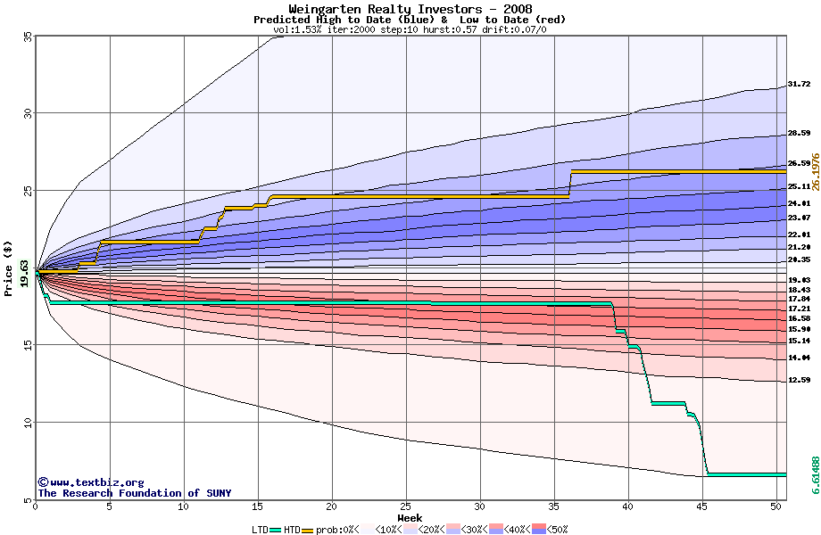 The high to date and low to date prices of the stock plotted against a random walk model for 2008 (what's this?).
