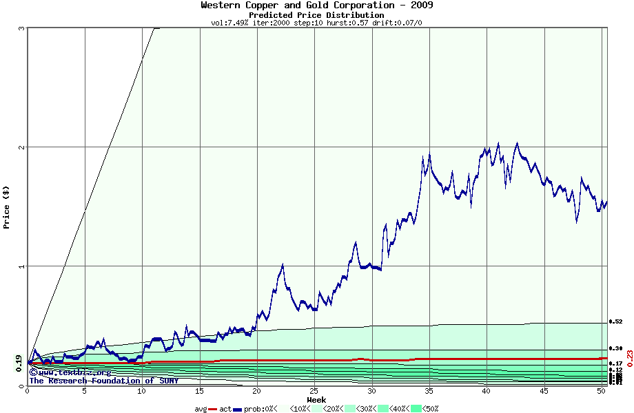 The following graph plots the year-to-date performance of the stock for 2009 compared to the probability calculated by a random walk model.