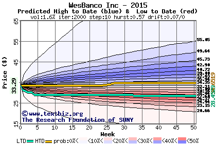The high to date and low to date prices of the stock plotted against a random walk model for 2015 (what's this?).