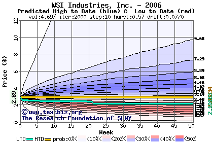 The high to date and low to date prices of the stock plotted against a random walk model for 2006 (what's this?).